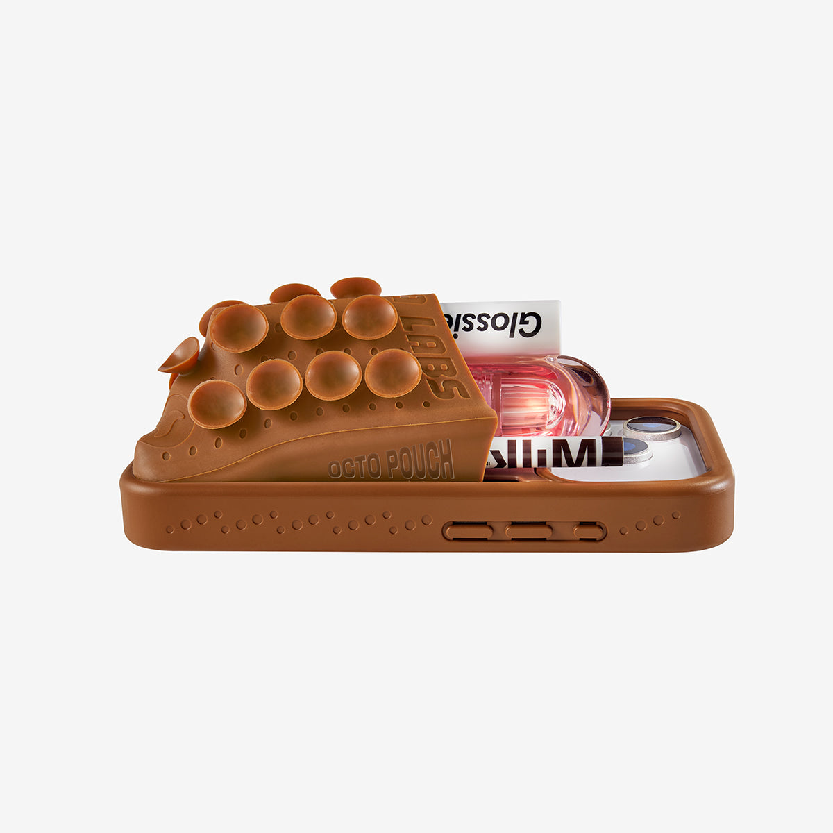 Octo Pouchは超伸縮性のポケット AND 16個のジャンボサイズの吸盤を備えています。小さなアクセサリーを収納し、なめらかな面に貼り付けられるように設計されています。